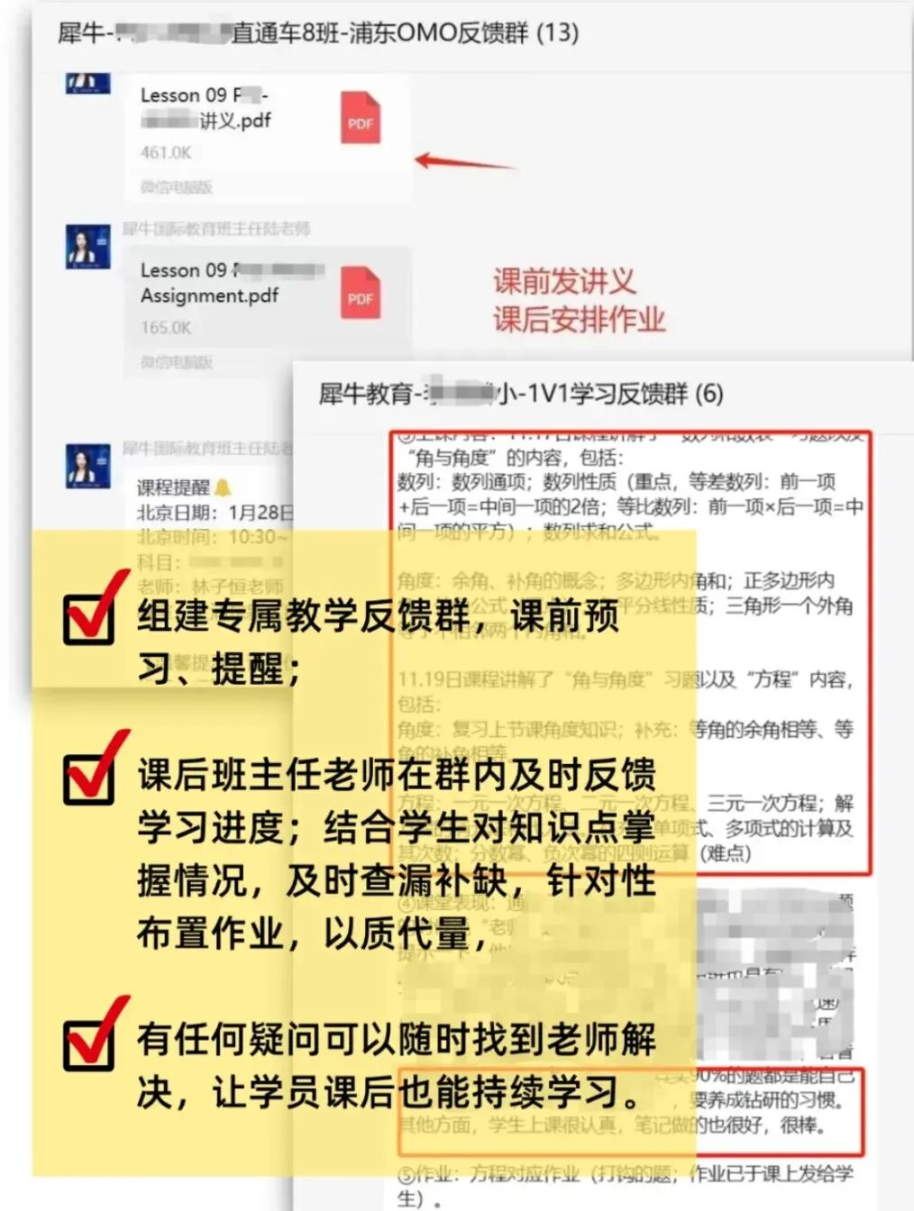 ✅犀牛为每位学员建立学习专属反馈群,班主任老师全程跟班,助教老师及时反馈学习进度以及学习内容,针对性的布置作业帮助学员查漏补缺,补齐短板。