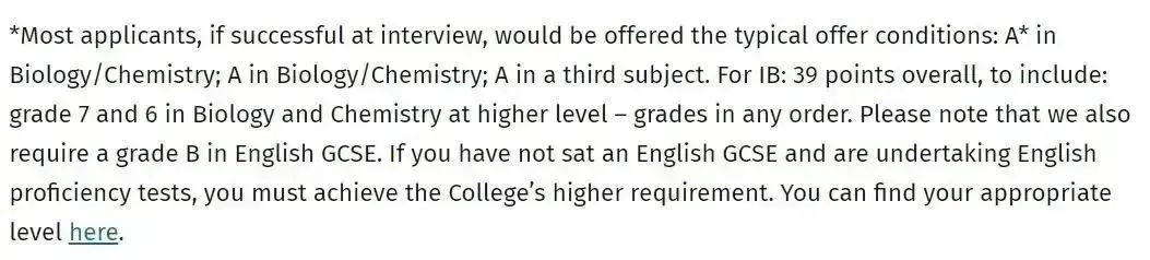 帝国理工学院大多数专业没有明确GCSE/IGCSE课程成绩。部分专业如医学会要求GCSE英语成绩达到B,在没有GCSE英语成绩的情况下,需要达到其他英语语言的Higher标准。