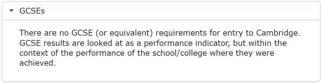 剑桥大学本科录取虽然没有对GCSE成绩作出明确要求,但GCSE仍然会作为录取指标之一,结合学校或学院整体成绩背景综合考查。