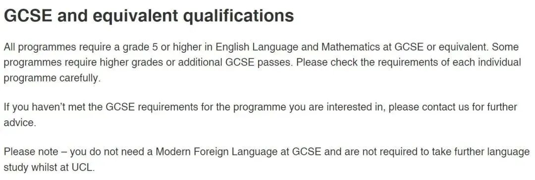 UCL所有专业都对IGCSE/GCSE英语语言和数学成绩提出要求!UCL官网明确指出,所有专业都要求IG英语和数学成绩至少达到5分或以上,个别专业要求更高。