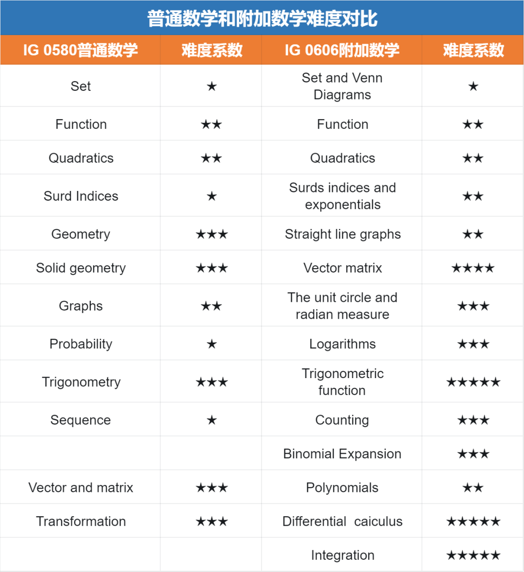 普通数学(0580)的难度低于附加数学(0606),通常情况下,同学们会选择普通数学(0580)来衔接A-Level数学,选择附加数学(0606)来衔接IB数学。