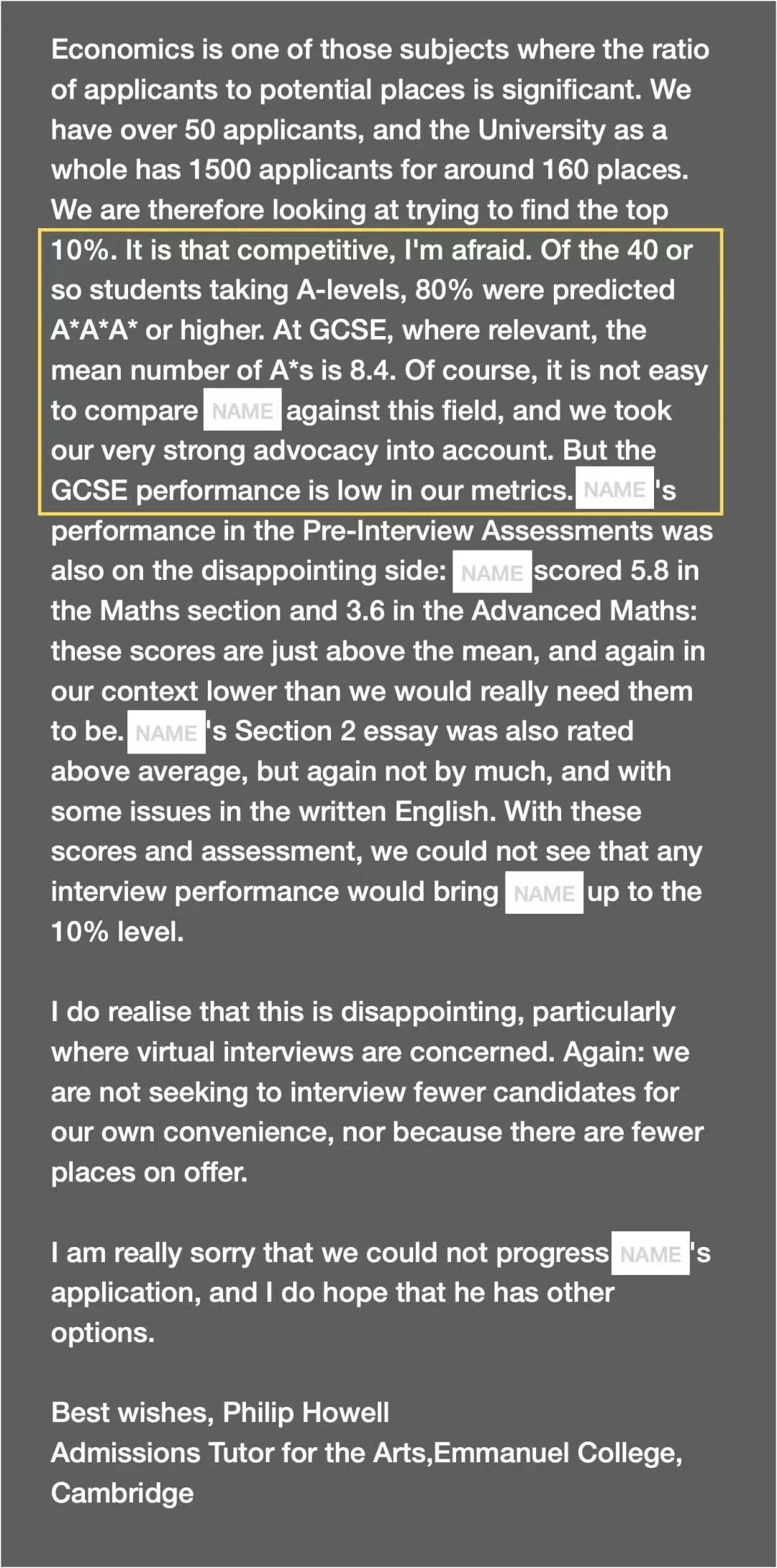 发出感慨是因为这位学生:剑桥大学最后没有给TA发面邀的原因是AL和IG的成绩未达到录取要求: