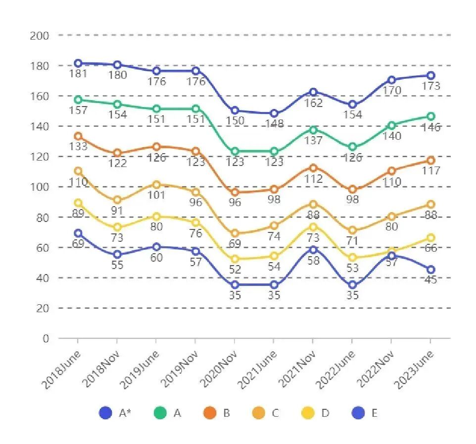 通过数据可知,IG数学近几年考试的A*平均分为167分左右,去年(2023年)五月大考的均分为173分。