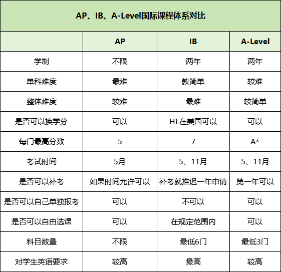 目前国际学校与国内高中国际班所使用的主流国际课程有三种AP/IB/A-Level课程体系。