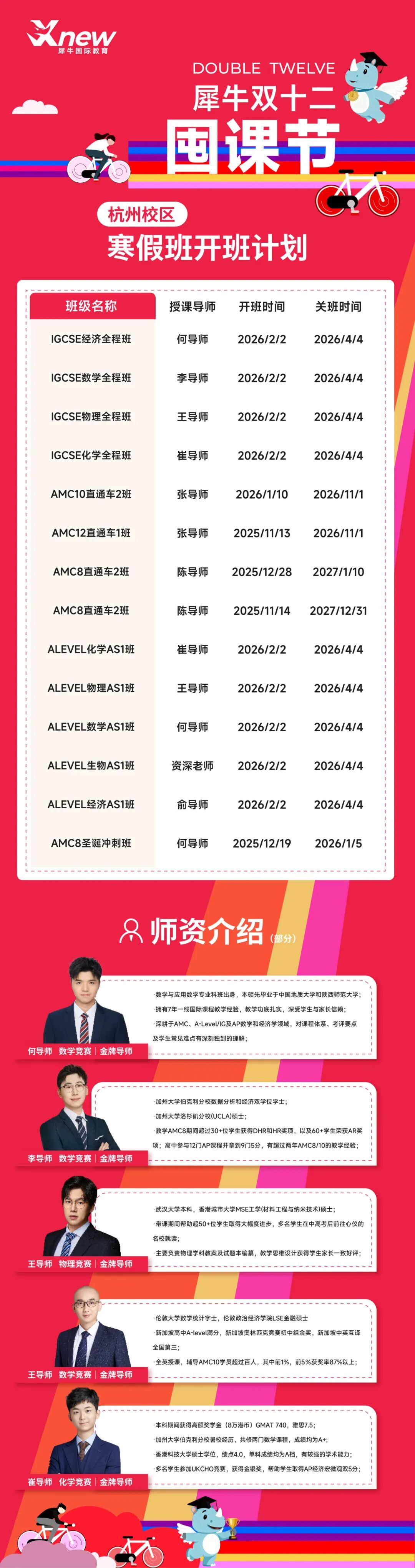 寒假是查漏补缺、实现跨越的关键期!杭州犀牛国际教育寒假班全面开启,IGCSE、A-Level、AMC 全科目系统覆盖,特邀来自加州伯克利、伦敦政经等世界名校背景的金牌导师团队,为你量身定制学习路径。无论你是备战竞赛,还是夯实学科基础,这个寒假,让我们助你高效规划、精准提分!