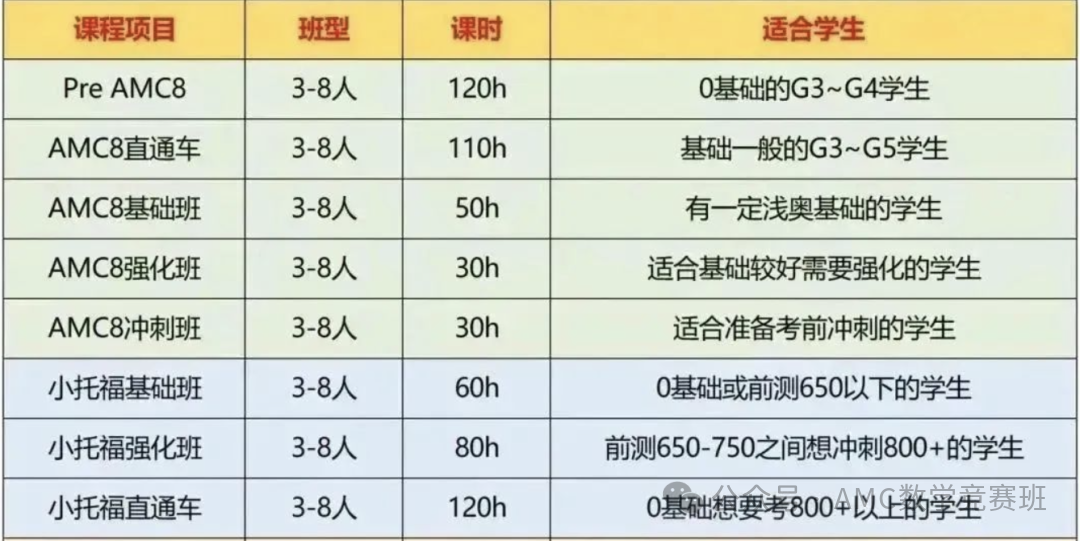 ✨ AMC8和小托福培训班课程班型 ✨ ✅ 科学分层:预备/基础/强化/冲刺多阶班型,适应不同起点 ✅ 年级匹配: