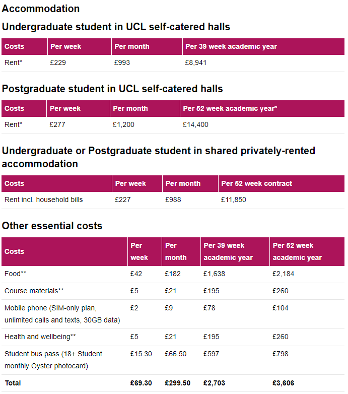 UCL的费用主要分为:学费、生活费两部分