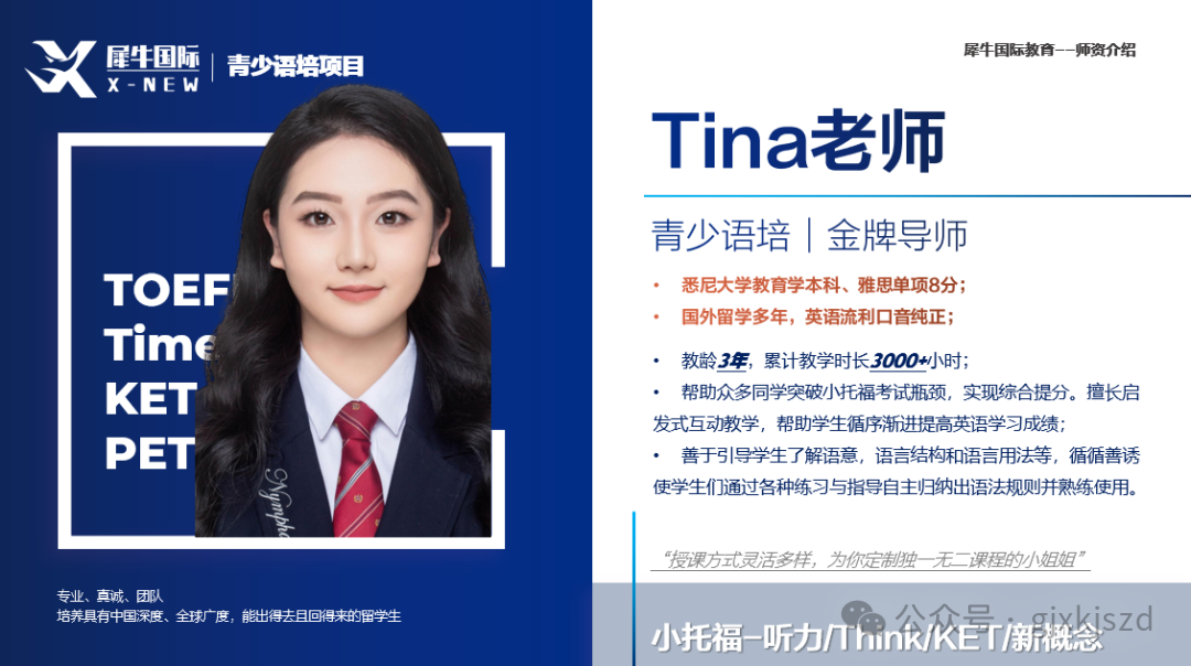 犀牛教育小托福教师普遍来自海内外外国语学校或英语专业,专业基础夯实,熟知小托福考试的规则和应试技巧,不仅自己懂小托福,还会把知识传递给不同学习基础的孩子,生动而形象地讲解知识。