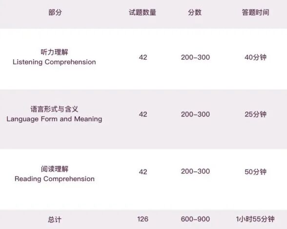 笔试部分由听力、语言形式与含义(语法)、阅读理解三大部分共同组成。每个板块300分,共计900分。考试时间115分钟,考试成绩的有效期为两年。