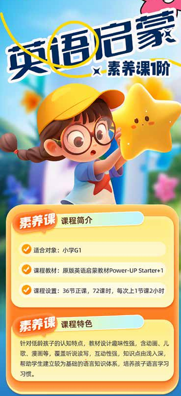 🌈犀牛英语启蒙素养课1阶适合对象:小学G1课程教材:原版英语启蒙教材Power-UP Starter+1课程设置:36节正课,72课时,每次上1节课2小时