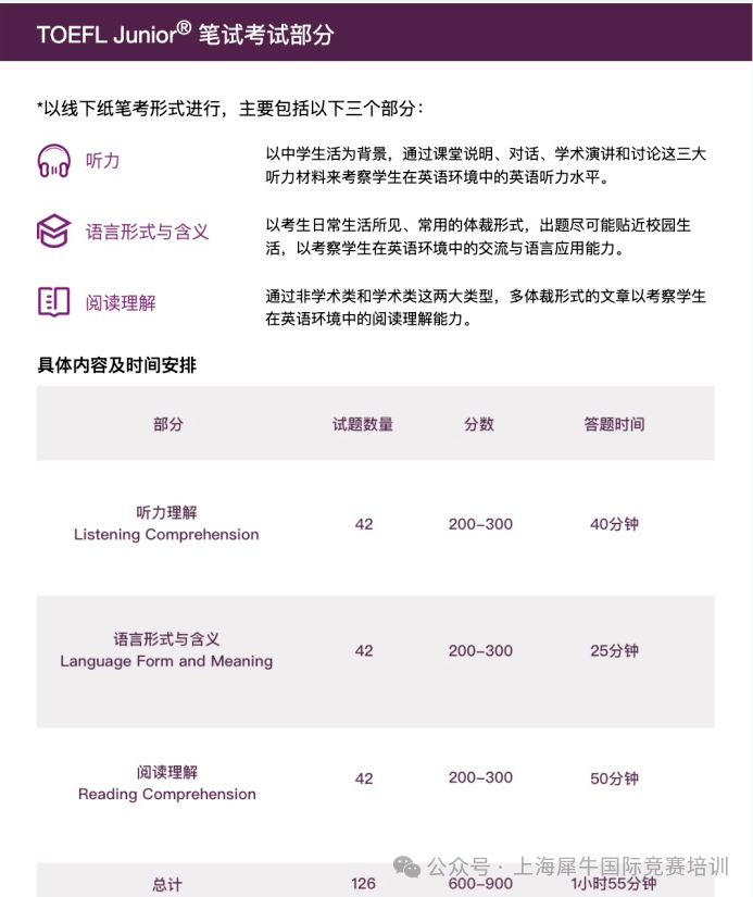 小托福笔试考试由听力、语言形式与含义(语法)、阅读理解三大部分共同组成,每个板块300分,共计900分,考试时间115分钟。(注:小托福最低分600分)