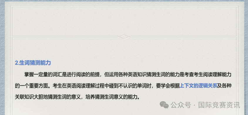 猜测词义是英语阅读理解的重要考点之一,考生在阅读的过程中,要学会根据上下文逻辑关系大胆猜测生词的含义。
