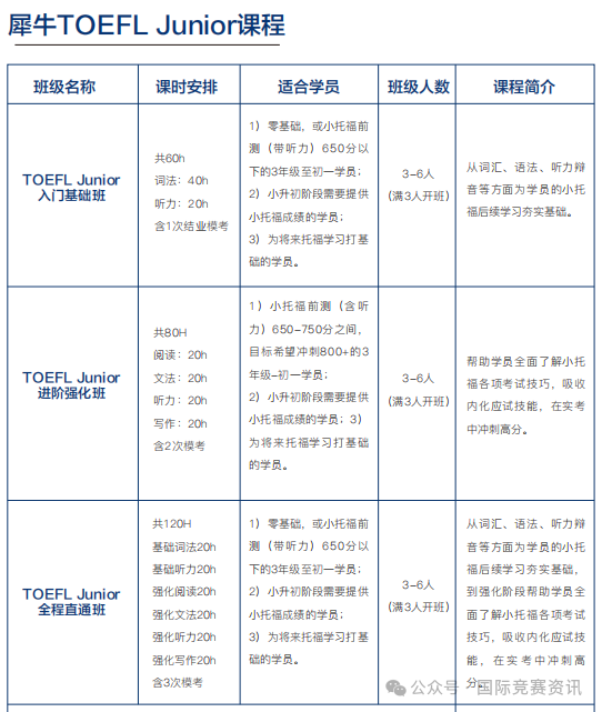 小托福课程包含基础/强化/冲刺/全程班,课程内容涵盖听力、词法、辨音、阅读、写作、刷题演练等,3-6人小班教学/1V1辅导,线上线下同步授课,让每一位学员都能提到针对性的辅导。