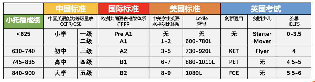 其次:小托福成绩也可以与中国的学习阶段和英国的考试对接起来。所以这门考试指导意义非常大。