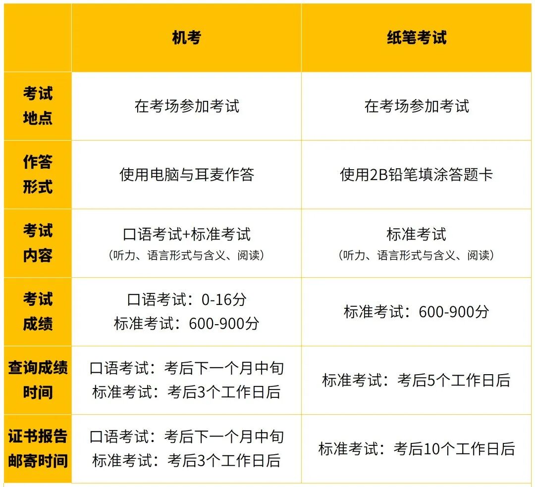 官方线下固定考点考试,只考察:①听力②语言形式与含义③阅读理解