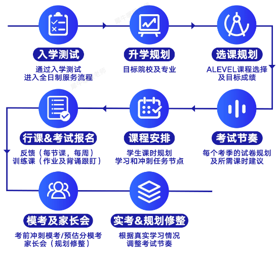 ·从入学测评制定个人规划,到主讲精讲、助教答疑、班主任全程督导跟进,再到规划师从升学角度统筹建议,我们覆盖每一个环节。