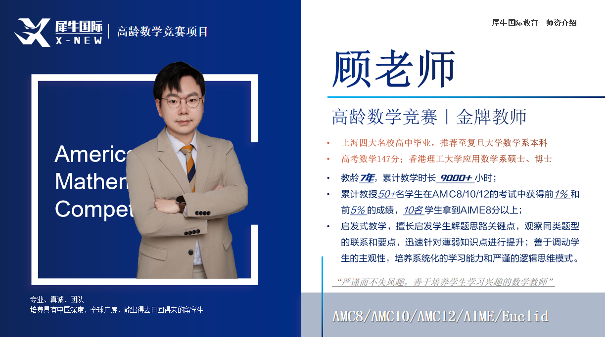 犀牛教育深谙此道,教练团队中90%以上的教师拥有清北复交、斯坦福、UCL等海内外名校的数学相关硕博背景,并且人均具备AMC/AIME高分或高中数学联赛获奖经历。