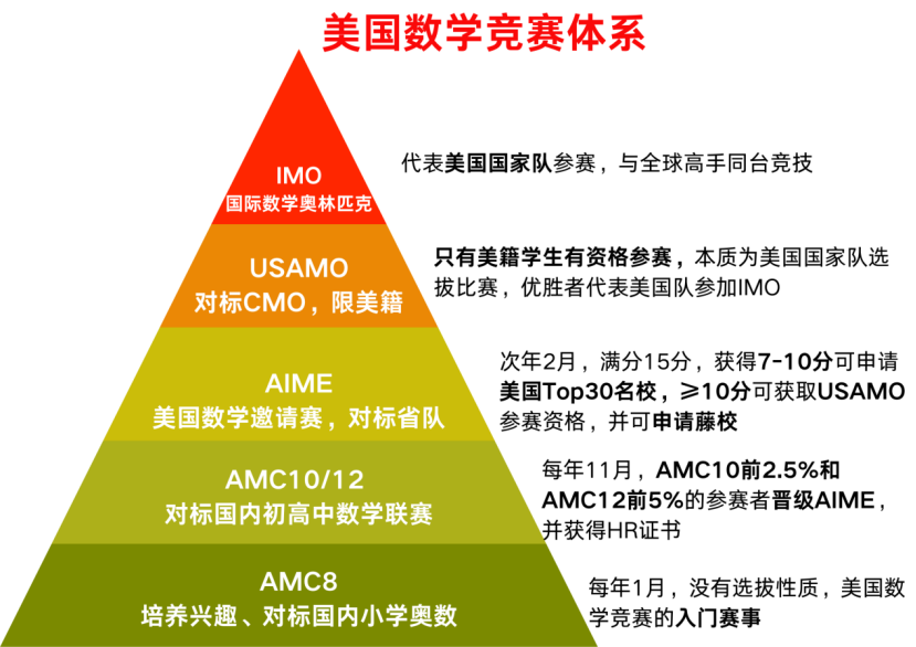 该赛事为系列竞赛包括AMC8/10/12、AIME、USA(J)MO、IMO,其中AMC10/12都可以晋级AIME。