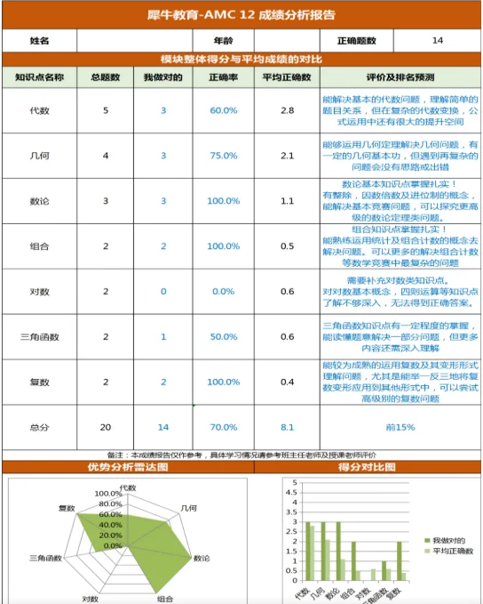 别担心,犀牛国际基于多年AMC10/12真题深入分析,专门推出竞赛前测卷。完成后,我们将为您提供一份详细的评估报告,从代数、几何、数论等各维度深度剖析你的能力水平,精准推荐适合你的竞赛阶段,并量身定制后续提升计划,助你高效备赛。