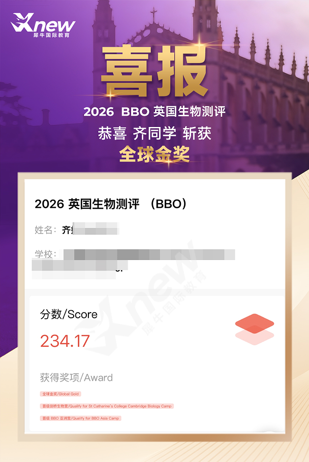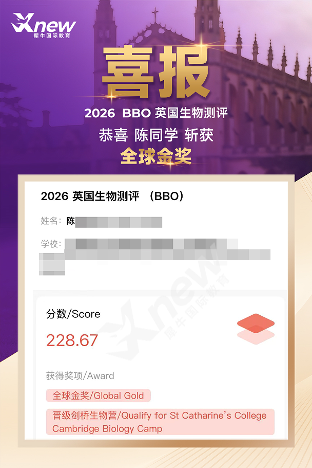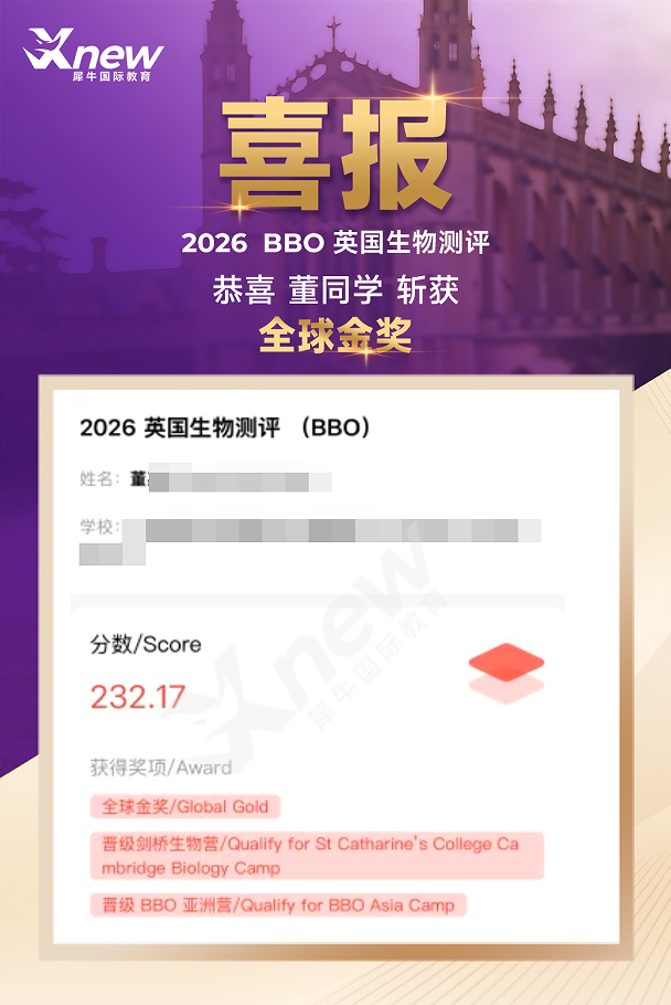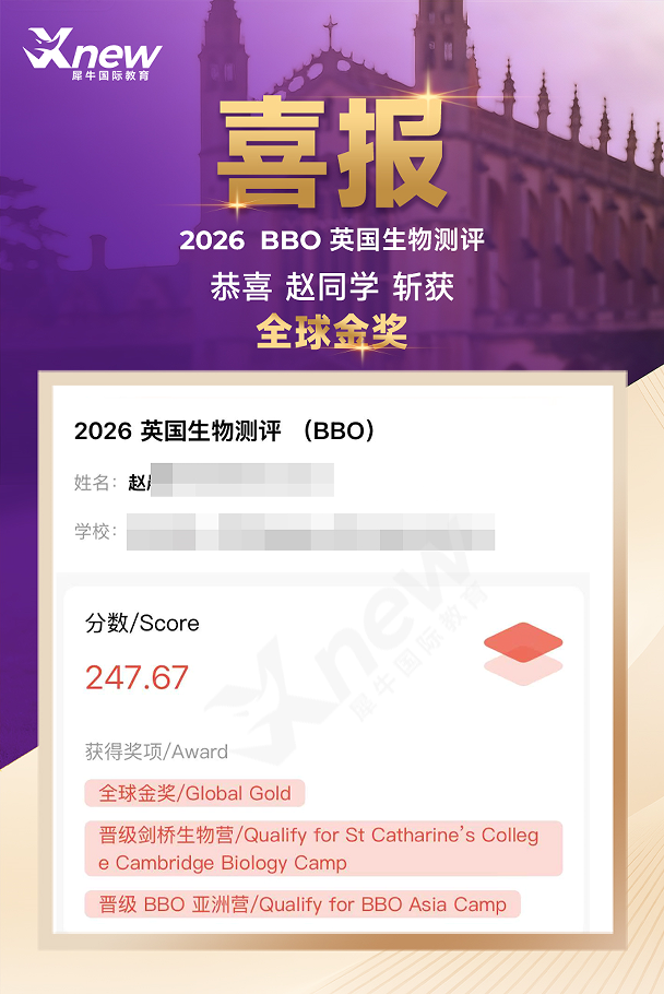 随着2026年BBO英国生物测评成绩揭晓,犀牛国际教育学员成绩单再度惊艳全场!在由犀牛的剑桥/帝国理工生物竞赛导师带领下,本届学员不仅批量斩获全球金奖,更有多人以超高分数晋级剑桥生物营及BBO亚洲营。从铜奖到近乎满分的金奖突破,我们用硬核战绩证明:选择比努力更重要!