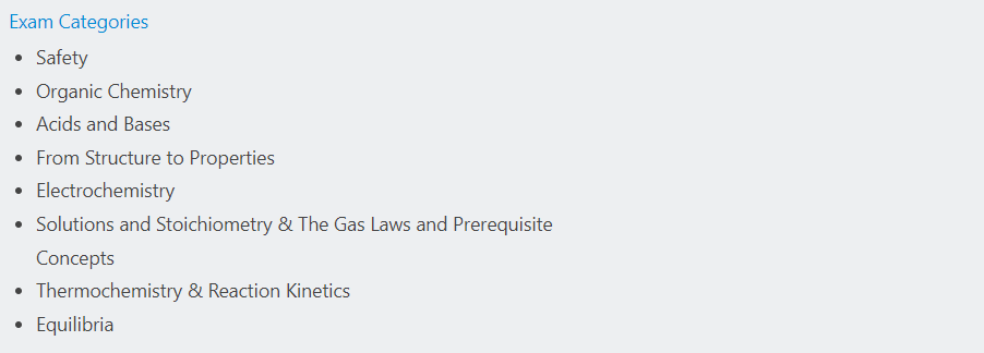 CCC的大纲有8个unit——安全性问题;有机化学;酸和碱;从结构到性质;电化学;溶液和化学计量学、气体定律和基本概念的先决条件;热化学、反应动力学;化学平衡。