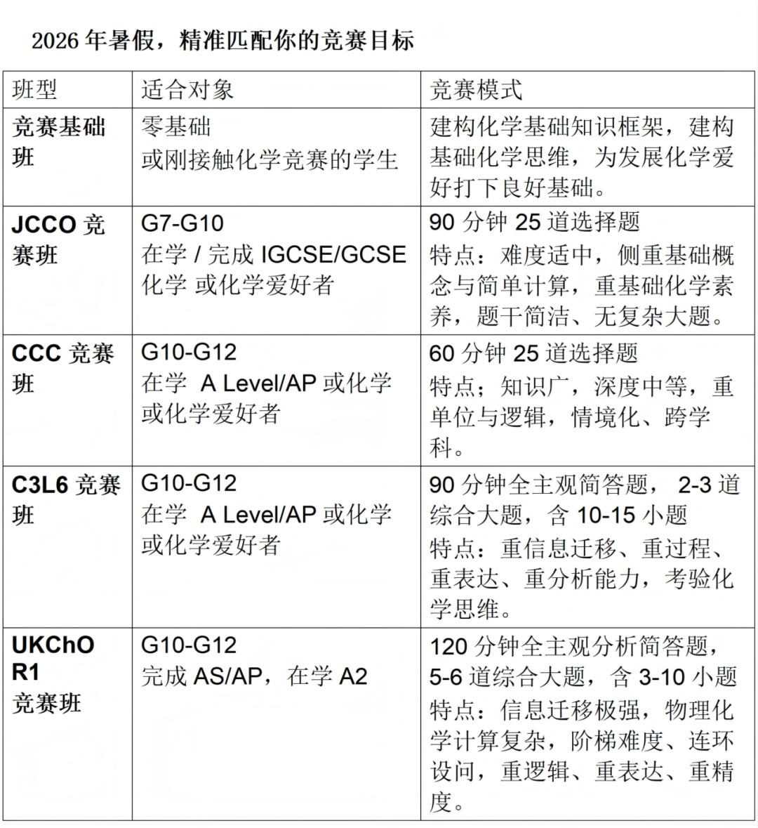 竞赛导师均具英美硕博专业背景 ;10年+辅导经验 ;丰富竞赛经验 ;资深考官经验。全英文在线授课,专属顾问辅助。帮助化学爱好者无缝适应国际竞赛的思维和答题环境,全面提升英语能力。