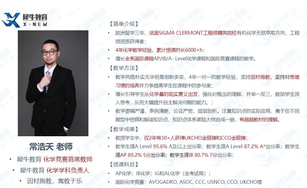 犀牛化学竞赛课程由化学方向金牌导师常老师带队,采用体系化教研的专业教材,将竞赛知识点与国际课程知识点重新整合。