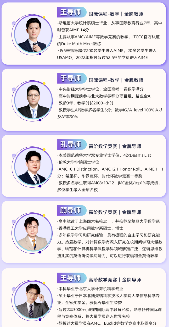 优势一:名师领航,洞悉考纲命脉犀牛欧几里得竞赛授课老师不仅有出色的学术背景,更对欧几里得近五年的命题趋势、评分偏好有着精准的把握。