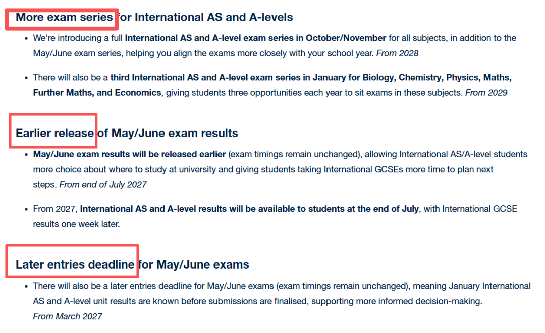 2027年7月底起:International AS和A-level成绩将在7月底公布(原为8月中旬),International GCSE成绩则在一周后发布。