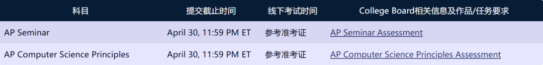 根据官方规定,AP Seminar、AP Research以及AP Computer Science Principles等科目,均需在考前完成作品/任务的提交。
