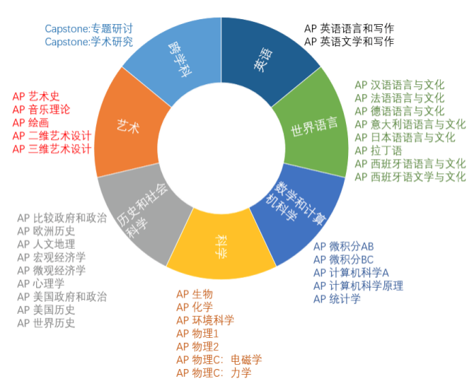 AP课程共开设40门学科,分为7大类,分别为艺术类、英语类、历史与社会科学类、数学与计算机科学类、自然科学类、世界语言与文学类,以及顶石文凭项目类。