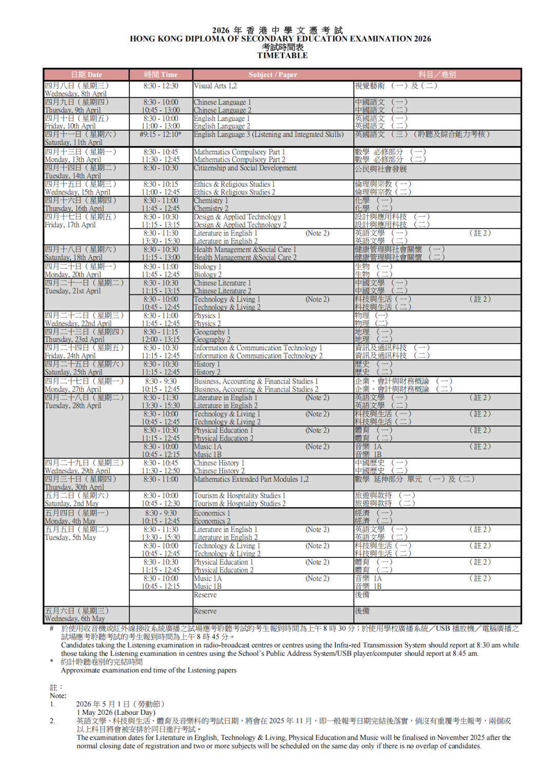 英国语文(口试):2026 年 3 月 10 日 - 19 日(17:00-20:30);特殊需要考生专场 3 月 21 日(9:00-17:30