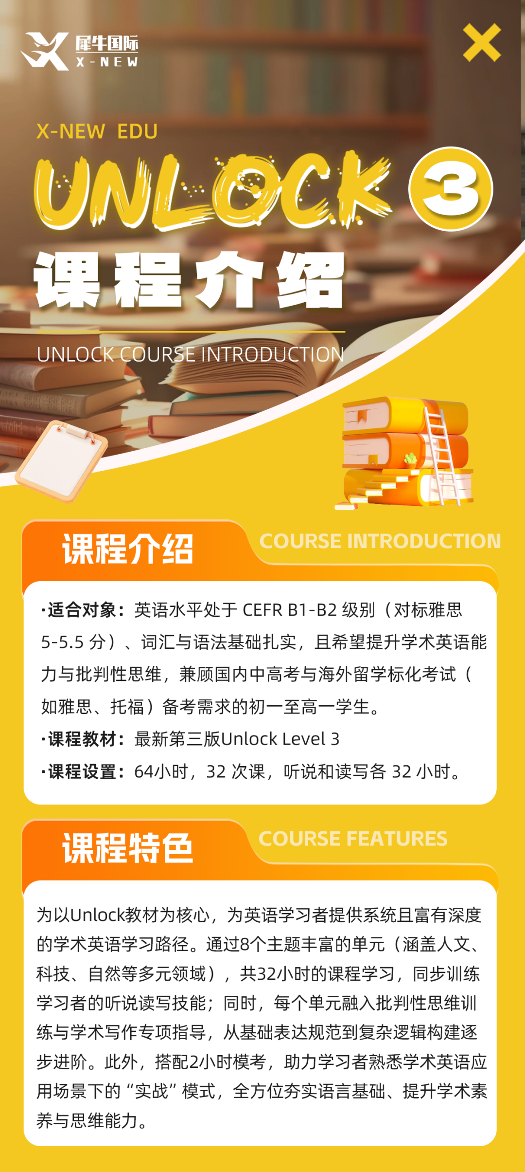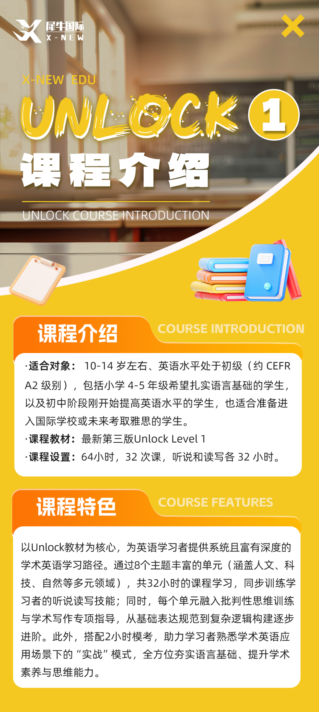 孩子英语学习陷入瓶颈?能力提升与应试难以兼顾?犀牛英语全新推出KET/小托福/Unlock课程培训,真正实现能力与考试双轨并行!让孩子不仅考出高分,更具备真实语言运用能力。一套体系,全面突破,助力孩子自信走向英语学习新阶段!
